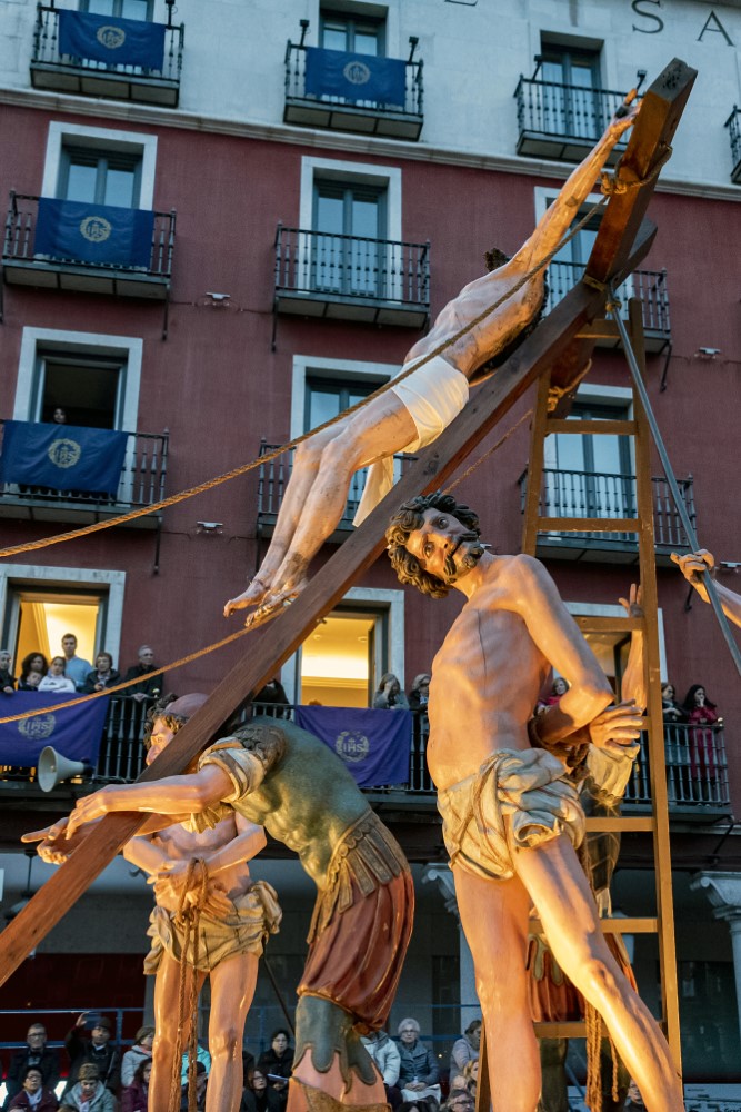 La Elevación de la Cruz (Francisco del Rincón, 1604). Se conserva en el Museo Nacional de Escultura. El originalmente conocido como "Paso del Levantamiento" es pionero de la imaginería procesional vallisoletana, por ser el primero realizado en madera policromada en vez de papelón. Fue contratado por la Cofradía de la Pasión por 1200 reales, y en él pudo participar Gregorio Fernández, de cuyo taller era aún oficial el autor. Se cree que éste se inspiró en un dibujo de Antonio del Castillo que representa La Elevación de la Cruz. Al Cristo y los cuatro sayones originales se le añadieron los dos ladrones en 1657, quizá tallados por Francisco Díaz de Tudanca. El paso provocó tal entusiasmo que Lucas Sanz de Torrecilla hizo una copia para ser procesionado en Palencia. El paso venía procesionando con otro Cristo distinto, ahora incluido en el paso Todo está consumado, hasta que en 1995 se "descubrió" el original en el almacén del Museo, tomado hasta entonces por una figura del Buen Ladrón.