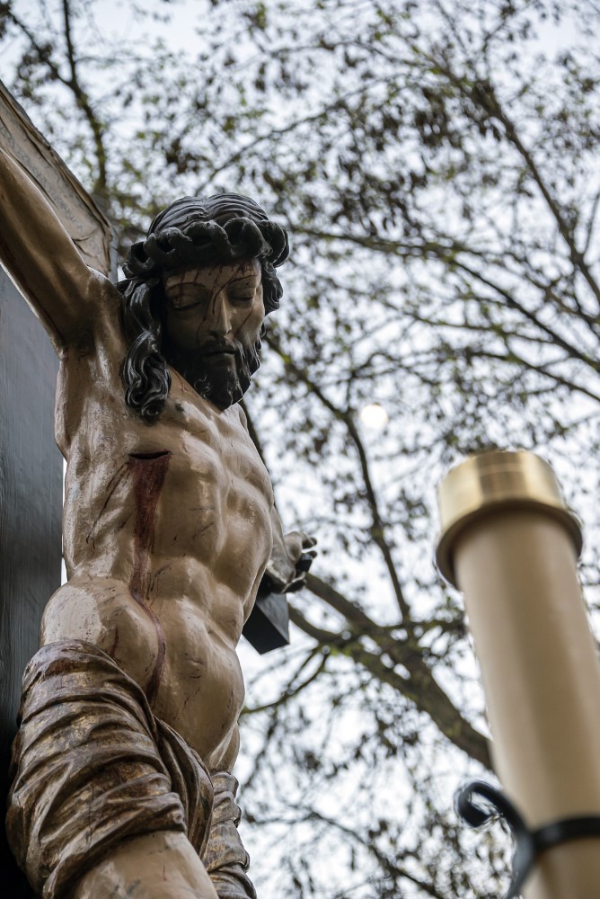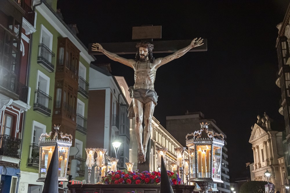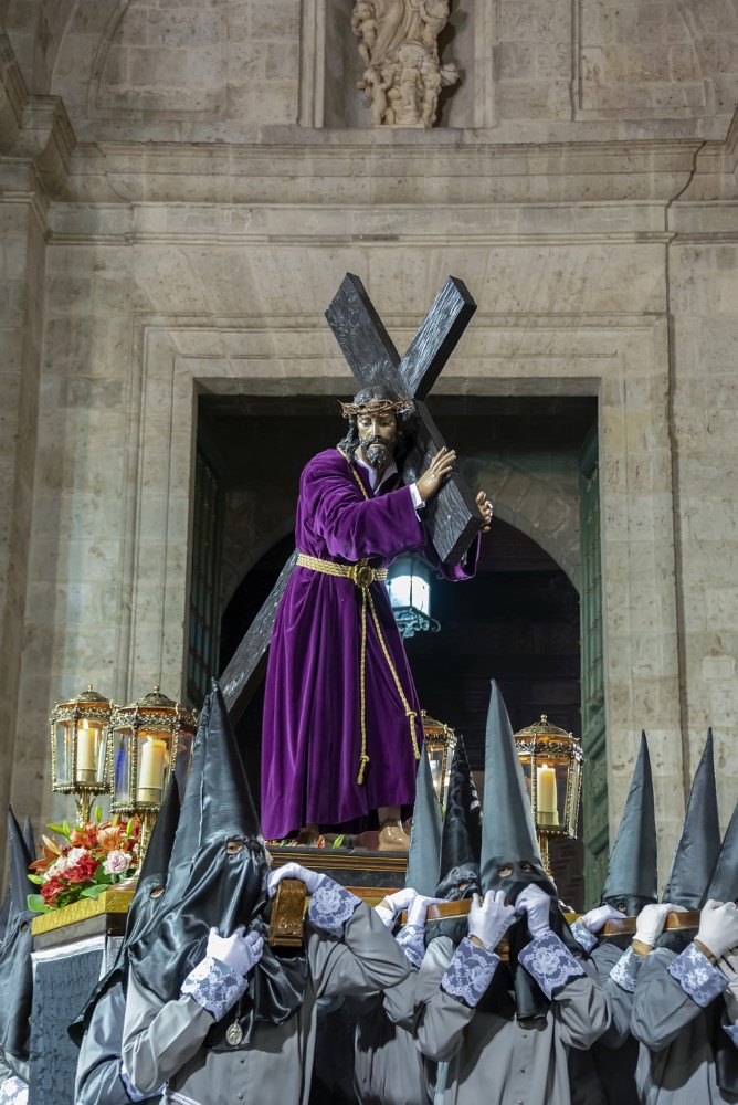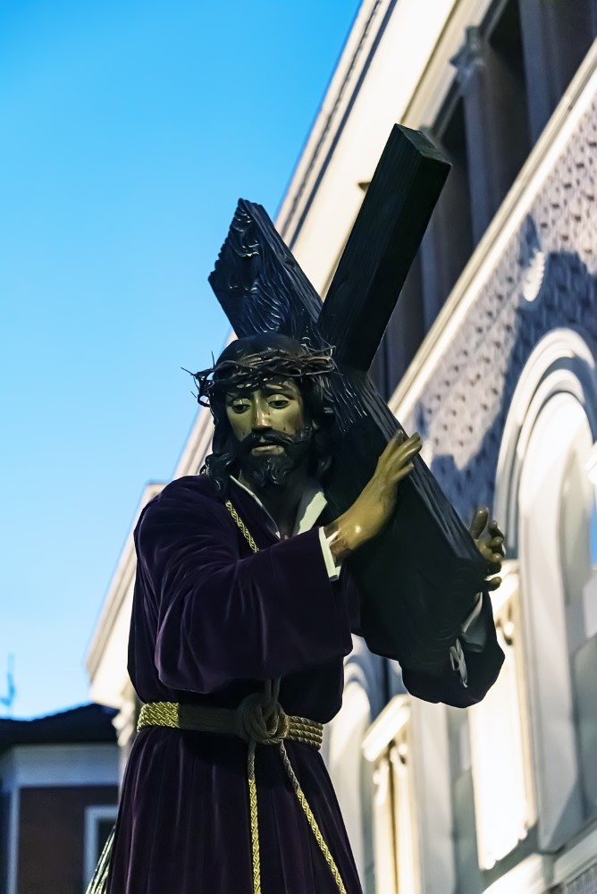 Nuestro Padre Jesús con la Cruz a cuestas. (Gregorio Fernández 1614). Esta representación de Cristo cargado con la cruz a cuestas, sobre su hombro izquierdo y sosteniendo uno de los brazos del patibulum con las dos manos, se presenta de pie, con la espalda arqueada denotando el peso de la cruz, tiene tallado el cuerpo desnudo, cubierto por una túnica de tela natural que refuerza el realismo de la imagen. En su hombro derecho figura incisa una P, como procedente de la Cofradía de La Pasión y también presenta una chapa metálica para encajar el extremo de la lanza con la que era herido por un sayón.