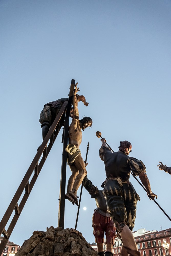 Todo está consumado (Cristo, anónimo del siglo XVII; la Virgen, San Juan, y María Magdalena, de seguidores de Gregorio Fernández o quizá de Francisco Díez de Tudanca, h. 1650). Fuera de la Semana Santa, en el Museo Nacional de Escultura. Originalmente propiedad de la cofradía de La Pasión y llamado "Paso Nuevo de la Virgen y San Juan", siendo policromado e inventariado en 1661. Fue reconstruido en 1927 por el arzobispo Gandasegui y Juan Agapito Revilla, llamándose Emisit Spiritum y siendo asignado en 1929 a Las Siete Palabras, e incluía el Cristo de las Cinco Llagas de la Cofradía de la Pasión y dos sayones, uno de ellos dispuesto a martillar un clavo ya innecesario. En 1948 las ruedas de la carroza se agarrotaron y el paso hubo de ser retirado de la Procesión General. En 1995 el Cristo y los sayones fueron retirados, se restauraron la Virgen, San Juan y la Magdalena y se incorporó el Cristo de La Exaltación de la Cruz, o Cristo del Calvario, también de la Cofradía de La Pasión. Ya en el siglo XXI este Cristo ha sido sustituido por un Crucificado procedente de la ermita de Bercero.