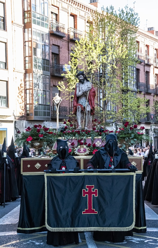 Procesión de Penitencia y Caridad (Jueves Santo, 18:30 horas). Este desfile participan con los tres pasos de Cristo de la Humildad (Cristo del Gallo), Cristo de la Cruz a María y La Quinta Angustia. Es tradición de la Cofradía en esta procesión indultar (al menos) a un preso, acto que se venía realizando en la Cárcel Provincial hasta su traslado a la localidad de Villanubla en 1995, a partir de lo cual el acto se viene realizando en la fachada principal de la Audiencia Provincial. Cuatro hermanos de la Cofradía proceden acceden al interior con un hábito para el indultado, que sale a la calle como un cofrade más, de forma que no es posible saber quién es. El indultado ha de empujar el paso de La Quinta Angustia en la procesión. El desfile cuenta con la presencia de autoridades locales del mundo jurídico y se completa con la realización de dos actos, el primero de ellos frente a a la residencia de ancianos de la calle Chancilleria y el segundo frente al Hospital Clínico Universitario con un acto de oración por los enfermos. Tambien es acompañado por escuadrón a caballo, escuadra y alumnos de la Academia de Ávila del Cuerpo Nacional de Policía