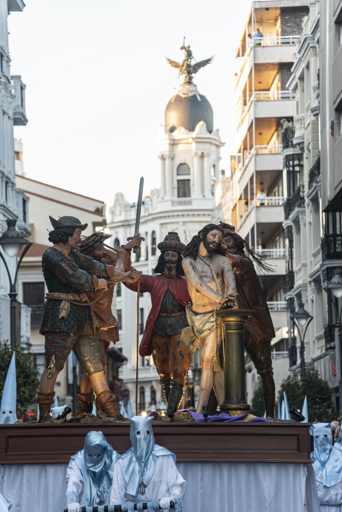 El Azotamiento del Señor, o La Flagelación del Señor (Escuela Castellana, h. 1650). Propiedad de la Cofradía de La Sagrada Pasión; el Cristo se venera en su iglesia (San Quirce y Santa Julita) y el resto de figuras se exhiben en el Museo Nacional de Escultura. Sólo se conoce la autoría de la figura del sayón azotador de la izquierda, original de Gregorio Fernández. Ninguna documentación avala la creencia popular de que el sayón que tira de la cuerda, popularmente "el chato", sea también suyo. Estos dos sayones pudieron pertenecer a un antiguo paso de El Azotamiento procesionado por la Vera Cruz. Consta que el Cristo fue policromado en 1650 por Pedro Antecha, y que se veneraba en la antigua iglesia de la Pasión, cuya Cofradía armaba el paso, según se cita en unas instrucciones de 1661. El paso completo fue reconstruido por Juan Agapito y Revilla para la restauración de la Semana Santa (1921-1922).
