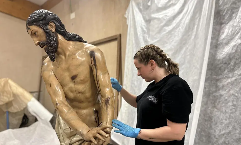 Una de las profesionales del Centro de Conservación y Restauración de la Fundación Edades del Hombre limpia una de las piezas extraídas de la Vera Cruz, 'El señor atado a la columna', de Gregorio Fernández. - Foto: E. Press