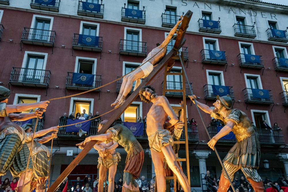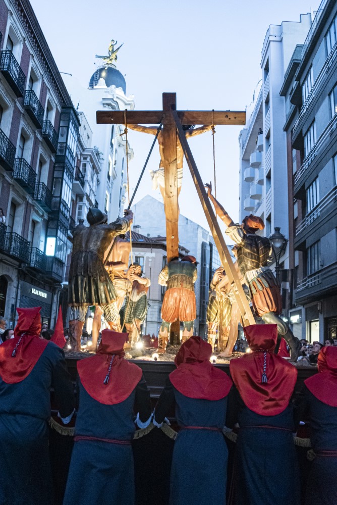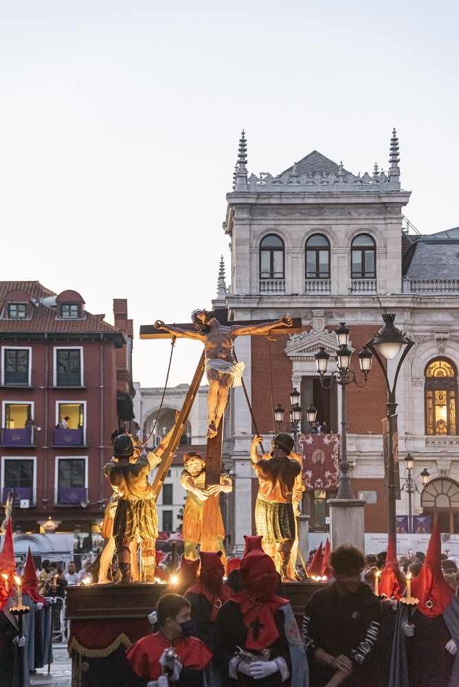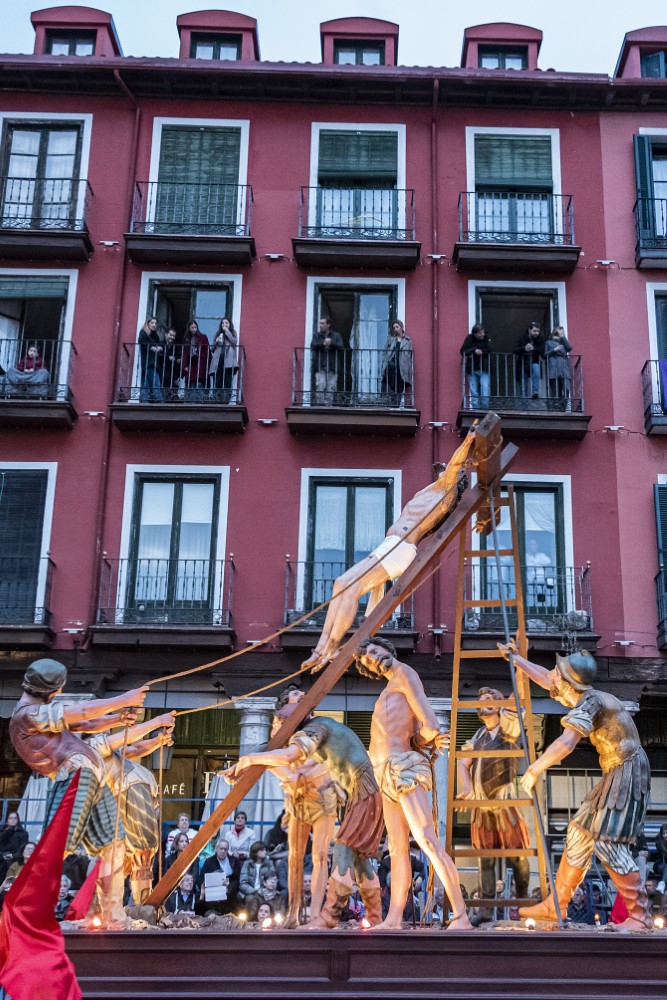 La Elevación de la Cruz (Francisco del Rincón, 1604). Se conserva en el Museo Nacional de Escultura. El originalmente conocido como "Paso del Levantamiento" es pionero de la imaginería procesional vallisoletana, por ser el primero realizado en madera policromada en vez de papelón. Fue contratado por la Cofradía de la Pasión por 1200 reales, y en él pudo participar Gregorio Fernández, de cuyo taller era aún oficial el autor. Se cree que éste se inspiró en un dibujo de Antonio del Castillo que representa La Elevación de la Cruz. Al Cristo y los cuatro sayones originales se le añadieron los dos ladrones en 1657, quizá tallados por Francisco Díaz de Tudanca. El paso provocó tal entusiasmo que Lucas Sanz de Torrecilla hizo una copia para ser procesionado en Palencia. El paso venía procesionando con otro Cristo distinto, ahora incluido en el paso Todo está consumado, hasta que en 1995 se "descubrió" el original en el almacén del Museo, tomado hasta entonces por una figura del Buen Ladrón.