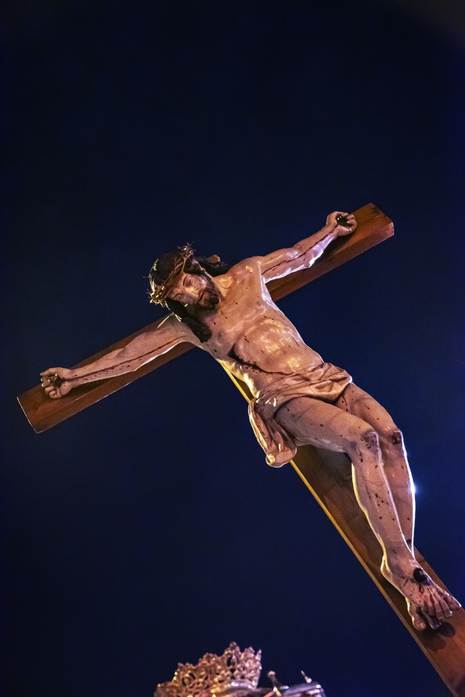Procesión General de la Sagrada Pasión del Redentor (Viernes Santo, 19:30 horas). Alumbra el paso de La Elevación de la Cruz.
