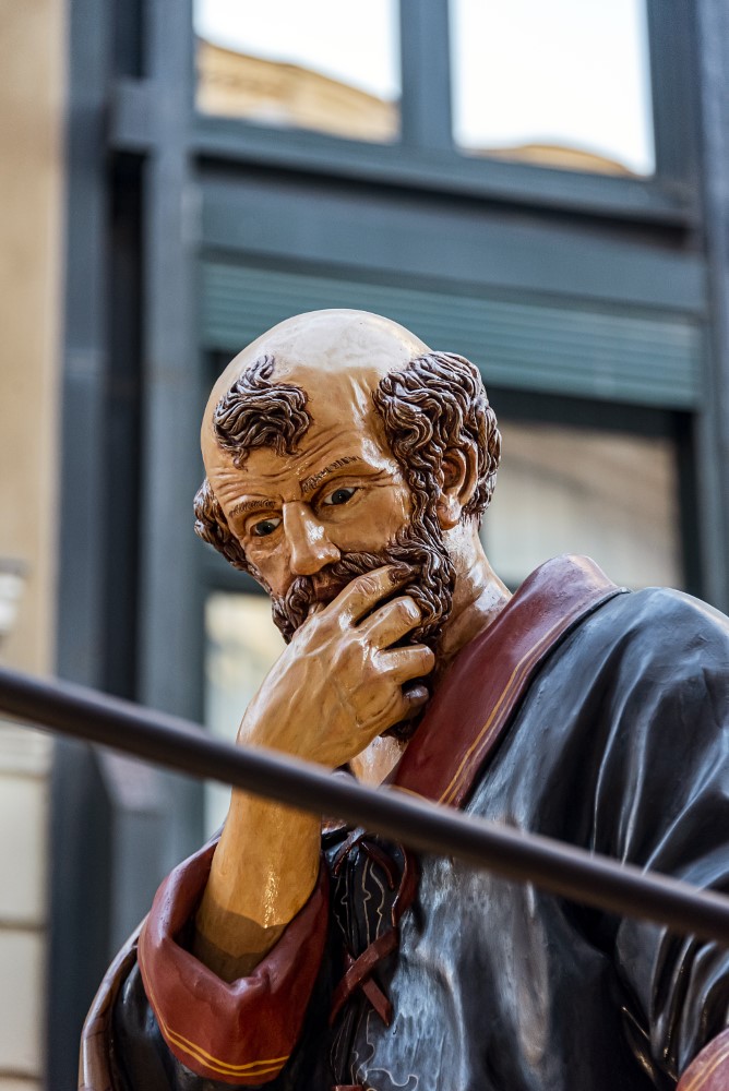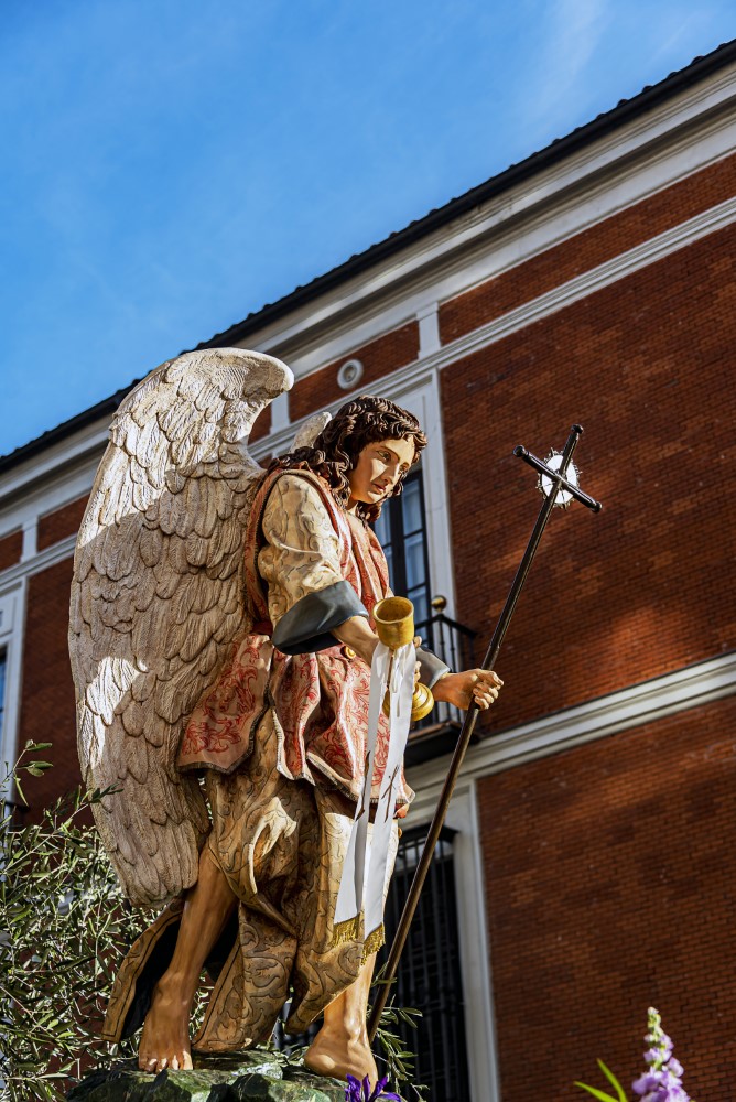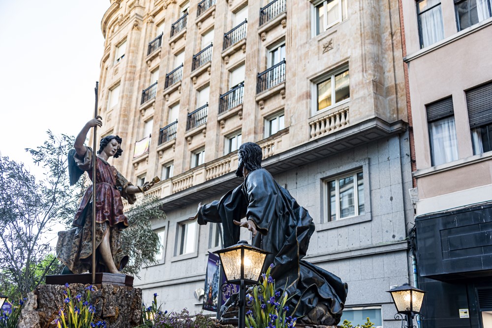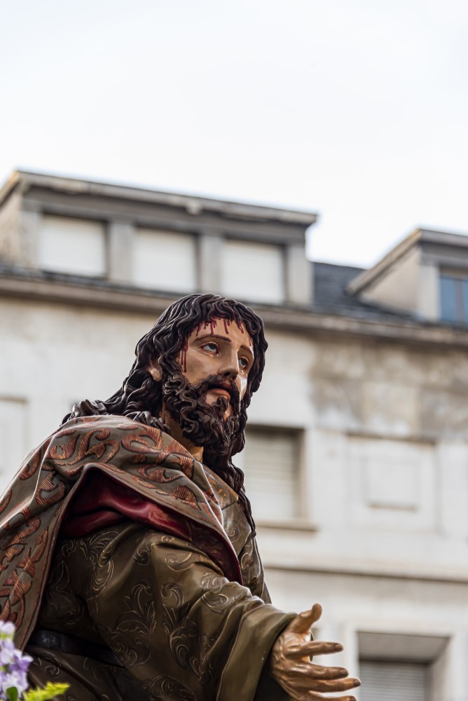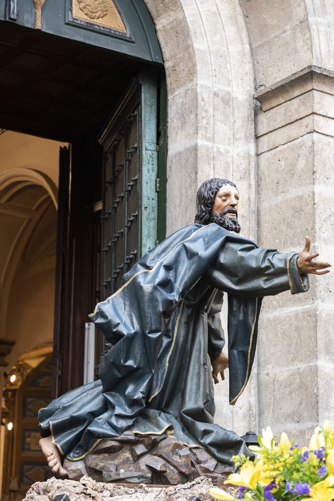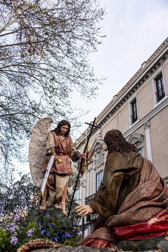 Oracion en el Huerto (Miguel Ángel Tapia, 2002). La escena se compone de dos imágenes de tamaño natural, ambas de talla completa en madera de pino de Soria doradas, estofadas y policromadas.