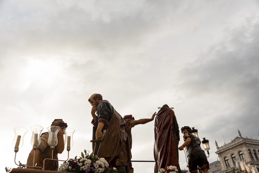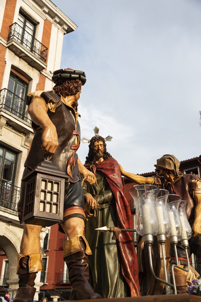 El Prendimiento (Miguel Ángel Tapia, 1995-2011). Cristo, cautivo, es conducido por dos sayones. Un tercero, Malco, se encuentra en el suelo con gesto de dolor tras haberle arrancado la oreja San Pedro, que, con la espada en la mano, se muestra pensativo por todo lo ocurrido. Las imágenes, de gran tamaño, robustez y detalle, mantienen la tradición barroca de la Semana Santa vallisoletana. El escultor ha sido especialmente cuidadoso en esta escena, en cuanto que los dos sayones que prenden a Jesús llevan una lanza y una linterna (recuperando la tradición del paso de La oración del Huerto), mientras que San Pedro posee la misma fisionomía y ropajes que en el paso de Las Lágrimas de San Pedro, el siguiente en la Procesión General. Este paso vino desfilando incompleto hasta su conclusión: la figura de Cristo desfiló sola desde 1995 hasta 2004, en el que se añadió el sayón de la linterna, en 2005 se incorporó el de la lanza, San Pedro en 2007 y Malco en 2011, si bien el montaje completo no desfiló por primera vez hasta 2012, en la Procesión de Nuestra Señora de la Amargura, debido a la lluvia.