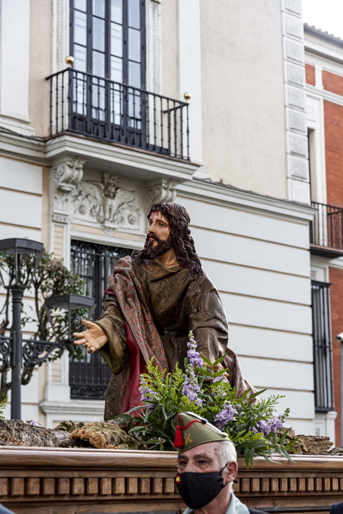 La cofradía acompaña los pasos de "El Prendimiento" y "La Oración del Huerto", ambos del escultor Miguel Angel Tapia. La cofradía se dirige al Convento de las RR. MM. Salesas donde tiene lugar un acto de oración, para posteriormente realizar estación de penitencia ante el Santísimo en la Catedral