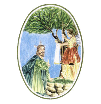 El Ángel Confortador, llamado en algunos textos apócrifos Egudiel, muestra un movimiento descendente reforzado tanto por la sensación de inestabilidad y avance que ofrece de la forma en que apoya los pies sobre las rocas, como por la forma en que ha dispuesto el autor el final de los pliegues de la túnica, así como las mismas rocas en ligera pendiente. Viste túnica blanca, con mangas vueltas a la altura de los codos cuyo interior es azul. Sobre ésta, una suerte de chaleco marrón que se prolonga hasta más abajo de la cintura, decorado con minuciosa decoración, anudado en la cintura con un ceñidor rojo. En la mano izquierda porta un báculo con forma de cruz, mientras que en la derecha porta un cáliz.