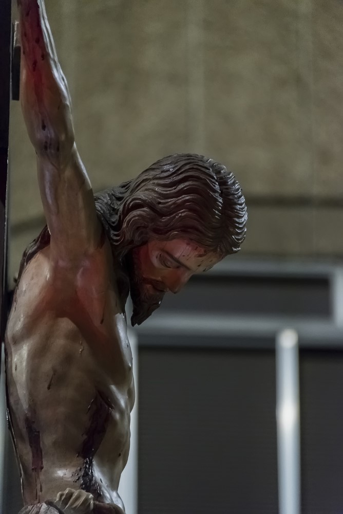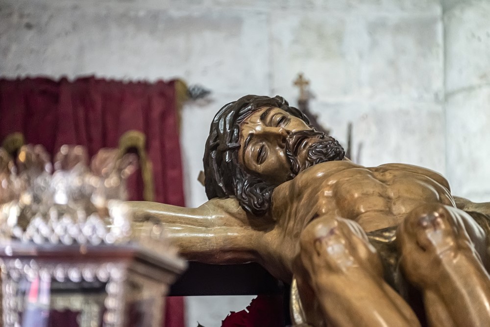 Santísimo Cristo de la Preciosa Sangre (Lázaro Gumiel, 1953). El "Cristo de la Preciosa Sangre", es una obra maestra de la escultura religiosa española del siglo XX. Inspirado en el estilo de Juan de Juni, Gumiel crea una visión renovada y audaz de Cristo muerto en la cruz, capturando la fortaleza física y espiritual del Redentor. La figura presenta una anatomía atlética y detallada, con los ojos entrecerrados, el peso del cuerpo sostenido sobre los pies, y una herida en el costado que deja caer las últimas gotas de sangre, simbolizando el sacrificio final.