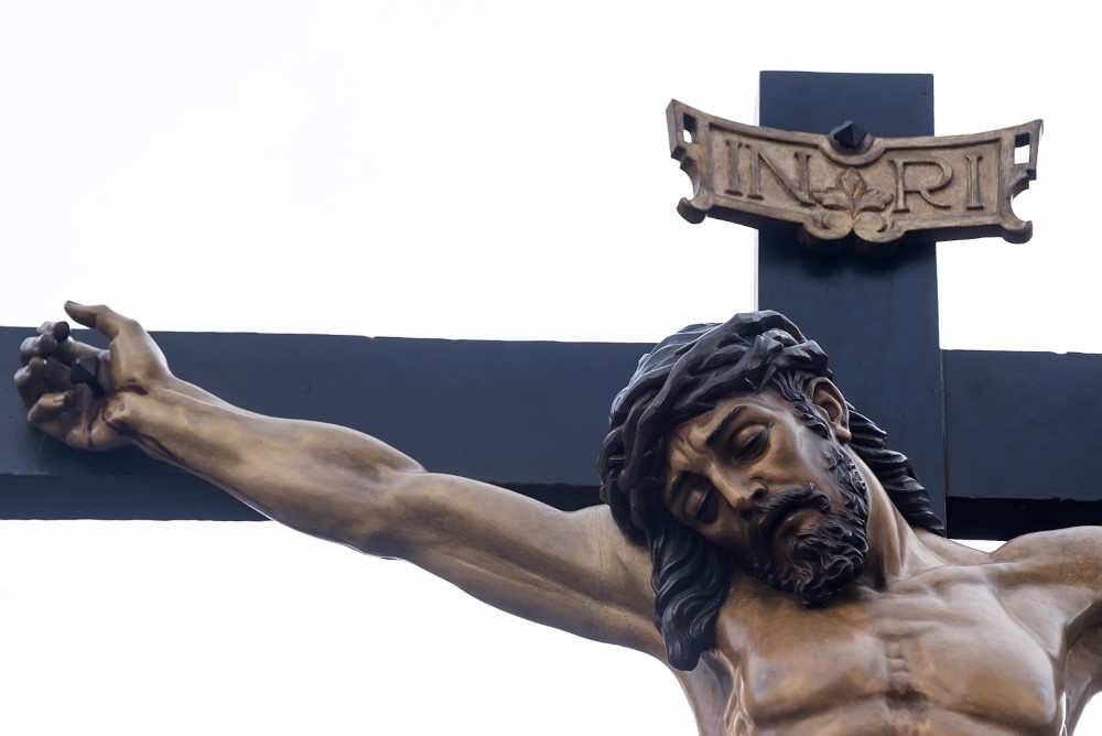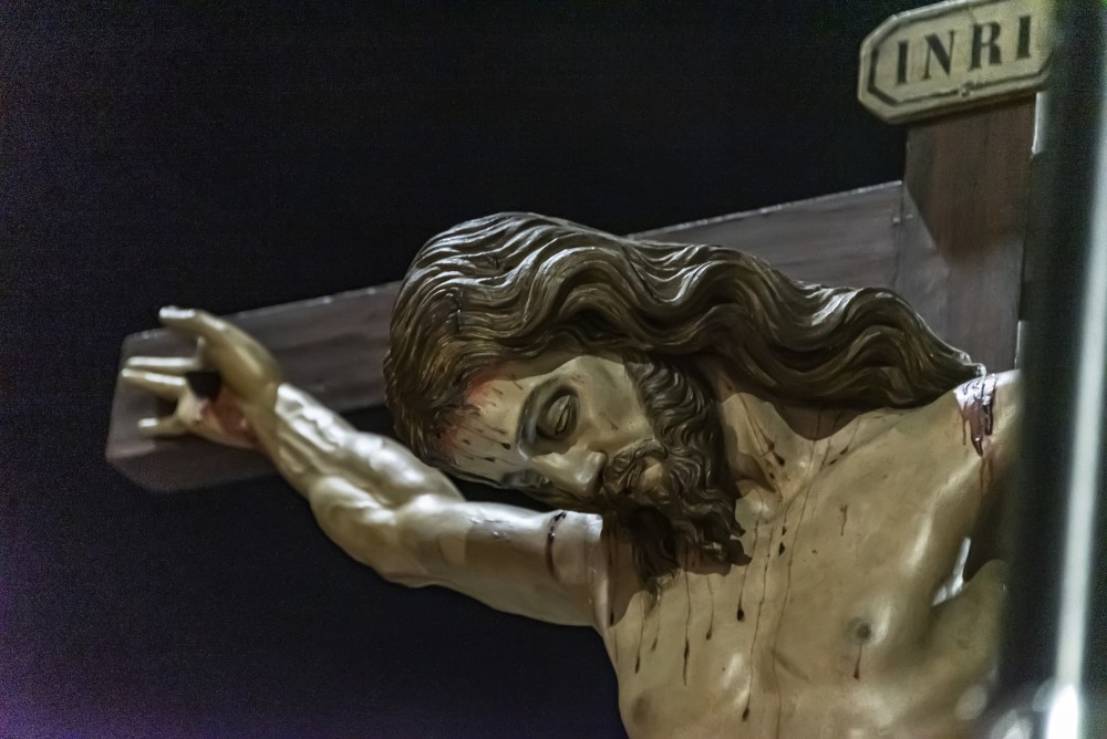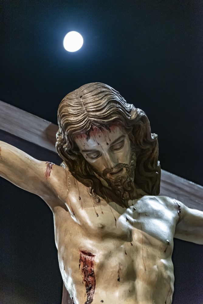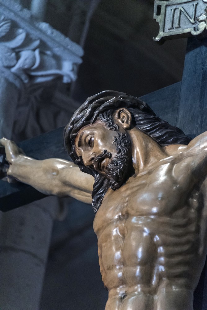 La cabeza de Cristo, ligeramente inclinada hacia la derecha, muestra una serenidad solemne, con detalles finos como la boca entreabierta y la barba corta, que fluye en suaves ondulaciones. Su cuerpo es una obra maestra de realismo anatómico: los músculos y venas, especialmente en los brazos y piernas, están delineados con gran precisión, mientras que las heridas muestran un sangrado naturalista, aunque algo exagerado en las rodillas.