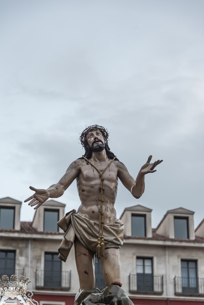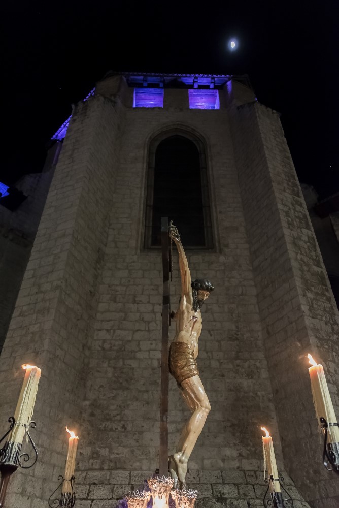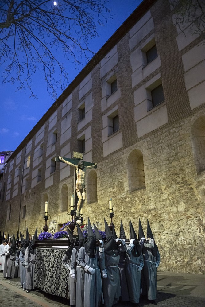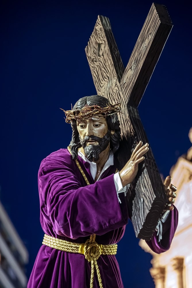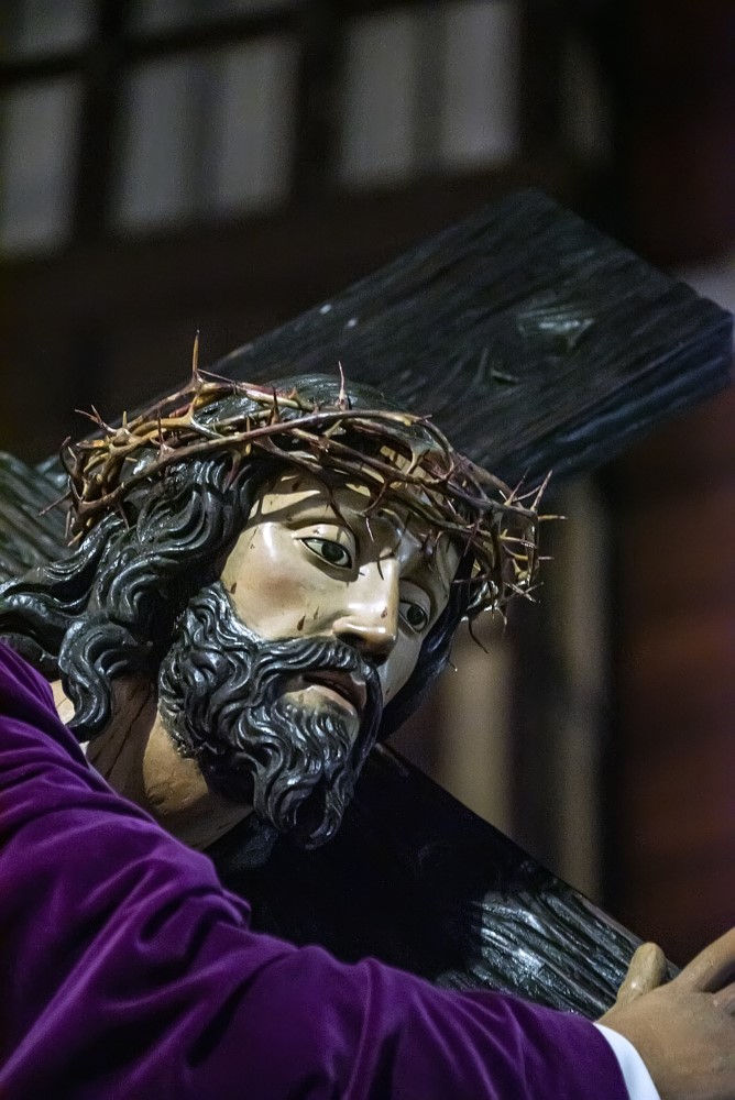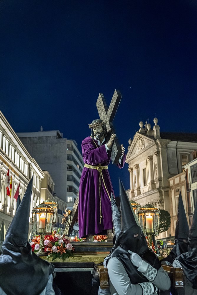 Nuestro Padre Jesús con la Cruz a cuestas. (Gregorio Fernández 1614). Esta representación de Cristo cargado con la cruz a cuestas, sobre su hombro izquierdo y sosteniendo uno de los brazos del patibulum con las dos manos, se presenta de pie, con la espalda arqueada denotando el peso de la cruz, tiene tallado el cuerpo desnudo, cubierto por una túnica de tela natural que refuerza el realismo de la imagen. En su hombro derecho figura incisa una P, como procedente de la Cofradía de La Pasión y también presenta una chapa metálica para encajar el extremo de la lanza con la que era herido por un sayón.