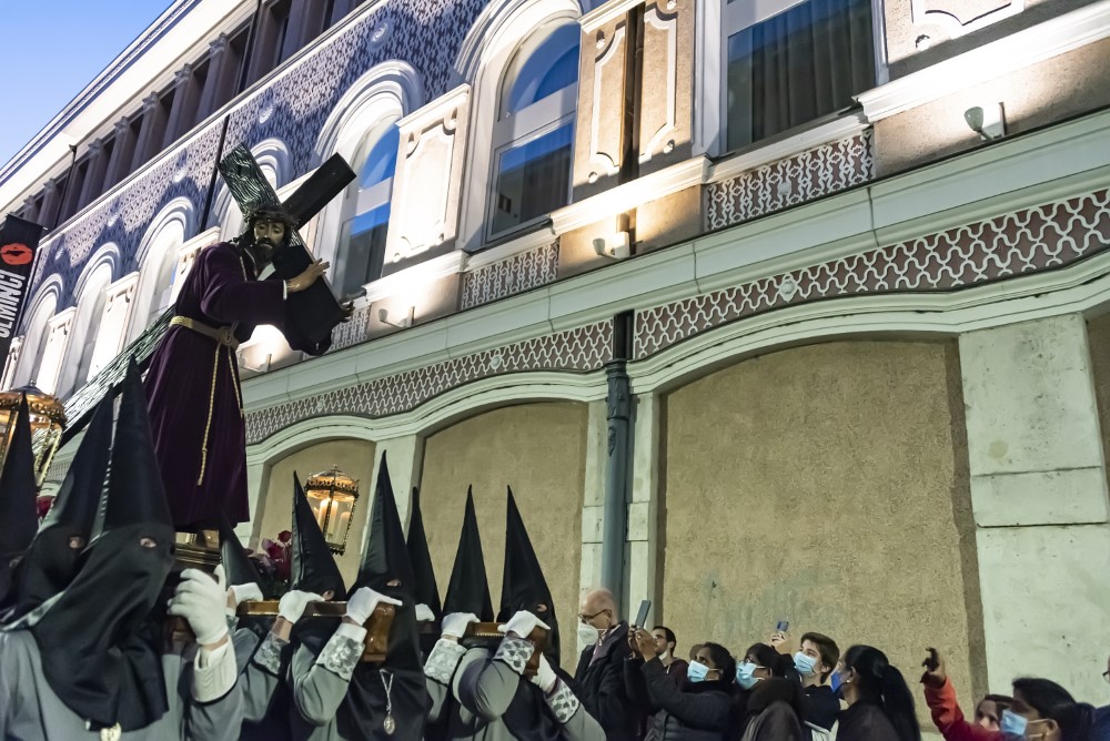 Procesión General de la Sagrada Pasión del Redentor (Viernes Santo, 19:30 horas). Acompañan a su paso titular, el Santísimo Cristo del Perdón.