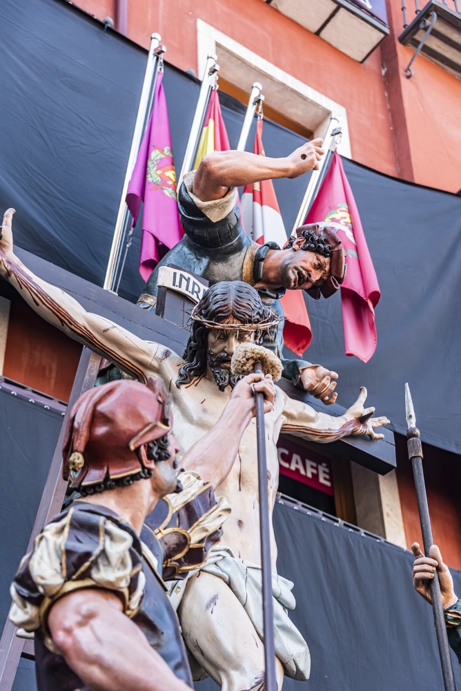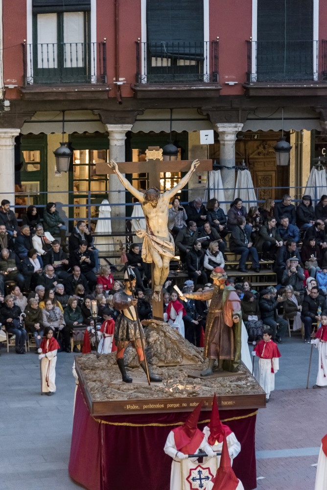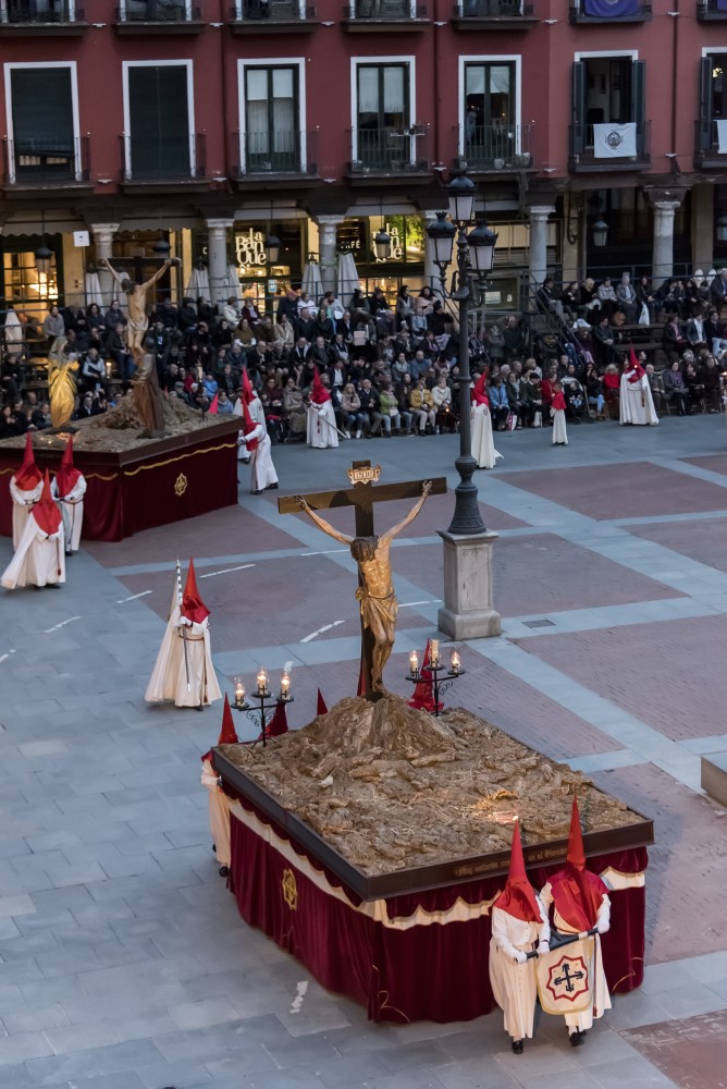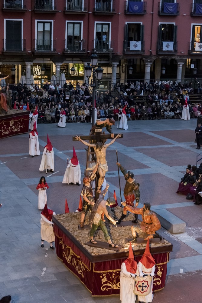 Sed tengo (Gregorio Fernández, 1612-1616). Propiedad de la cofradía de Jesús Nazareno, que lo llamaba Paso Grande o del Cristo Crucificado. Es seguro que el Cristo, un crucificado vivo, y los dos sayones que se juegan la túnica a los dados, son obra de Fernández, quien recibió 50 ducados en 1612 de la cofradía propietaria por un paso no mencionado pero que todo indica es éste. Pedro Márquez ofreció el paso a la cofradía en nombre de los maestros pasamaneros. El sayón de la lanza y el caldero para la esponja procede del primitivo paso de El Despojo también de la cofradía del Nazareno, obra de Melchor de la Peña en 1629. En 1717 la cofradía compra el sayón de la esponja y el de la escalera, procedentes del taller de Fernández y guardados en el Convento de San Agustín, al boticario Andrés Urban por 800 reales. Puede que fuese de los primeros pasos en desfilar sobre ruedas, pues constan pagos de reparaciones de ruedas en 1728 y 1730, aunque quizá sólo se usaran para sacarlo de la iglesia. Las figuras ya indicadas constan en el inventario de la cofradía de 1763. El paso fue reconstruido introduciendo al último sayón mencionado por el arzobispo Gandasegui, y fue asignado a la Hermandad de La Sagrada Familia, después de La Exaltación de la Cruz; desde 1944 está adjudicado a la Cofradía de Las Siete Palabras.