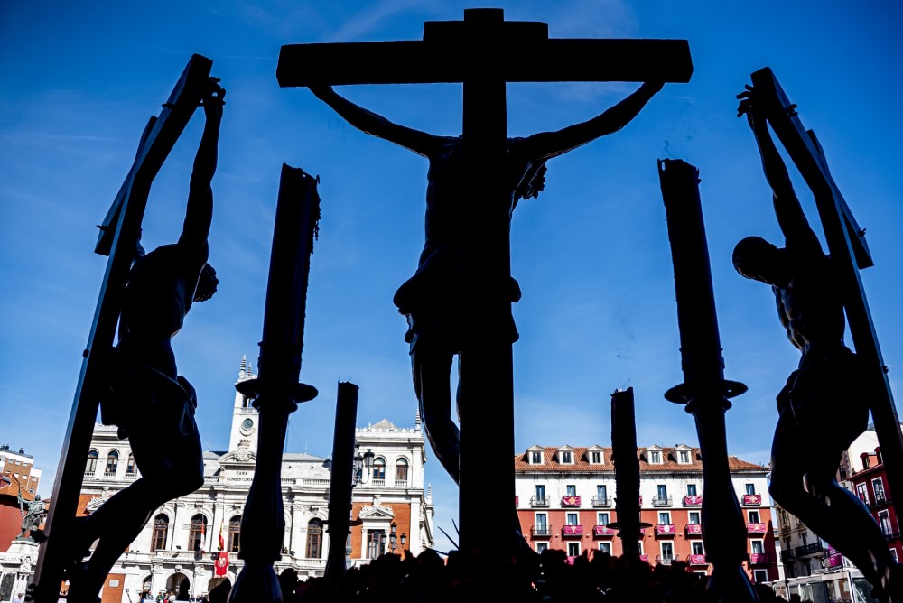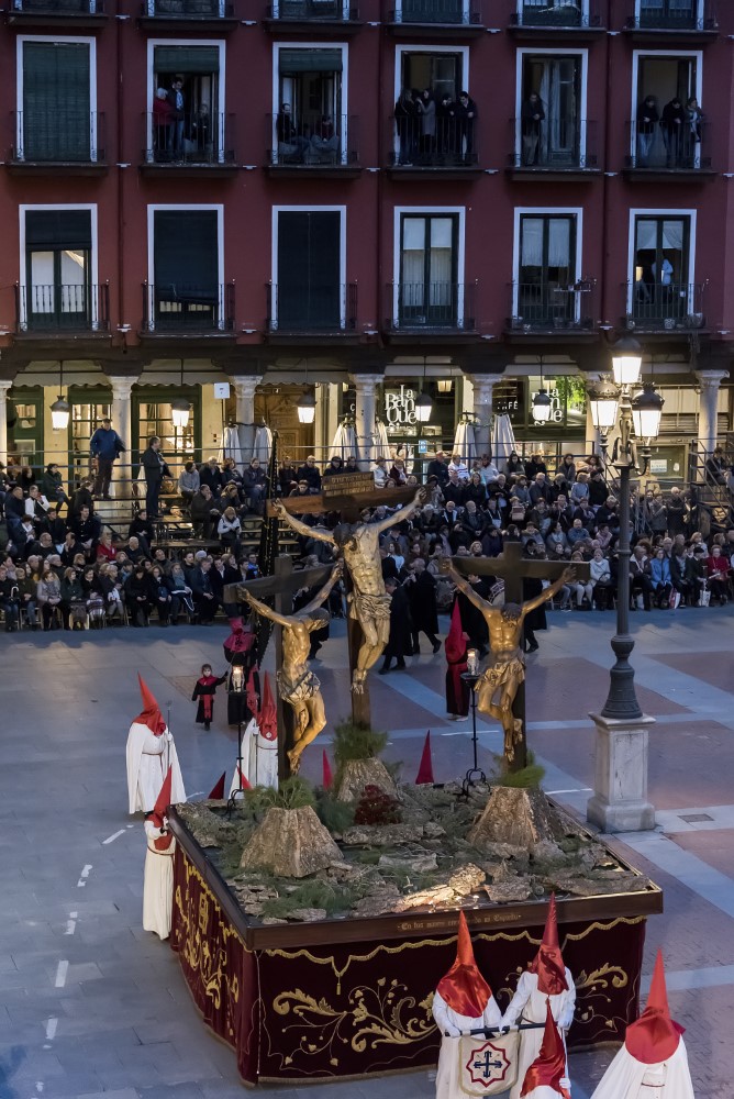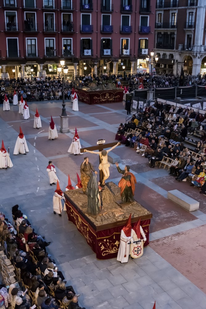 Todo está consumado (Cristo, anónimo del siglo XVII; la Virgen, San Juan, y María Magdalena, de seguidores de Gregorio Fernández o quizá de Francisco Díez de Tudanca, h. 1650). Fuera de la Semana Santa, en el Museo Nacional de Escultura. Originalmente propiedad de la cofradía de La Pasión y llamado "Paso Nuevo de la Virgen y San Juan", siendo policromado e inventariado en 1661. Fue reconstruido en 1927 por el arzobispo Gandasegui y Juan Agapito Revilla, llamándose Emisit Spiritum y siendo asignado en 1929 a Las Siete Palabras, e incluía el Cristo de las Cinco Llagas de la Cofradía de la Pasión y dos sayones, uno de ellos dispuesto a martillar un clavo ya innecesario. En 1948 las ruedas de la carroza se agarrotaron y el paso hubo de ser retirado de la Procesión General. En 1995 el Cristo y los sayones fueron retirados, se restauraron la Virgen, San Juan y la Magdalena y se incorporó el Cristo de La Exaltación de la Cruz, o Cristo del Calvario, también de la Cofradía de La Pasión. Ya en el siglo XXI este Cristo ha sido sustituido por un Crucificado procedente de la ermita de Bercero.