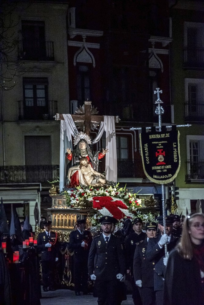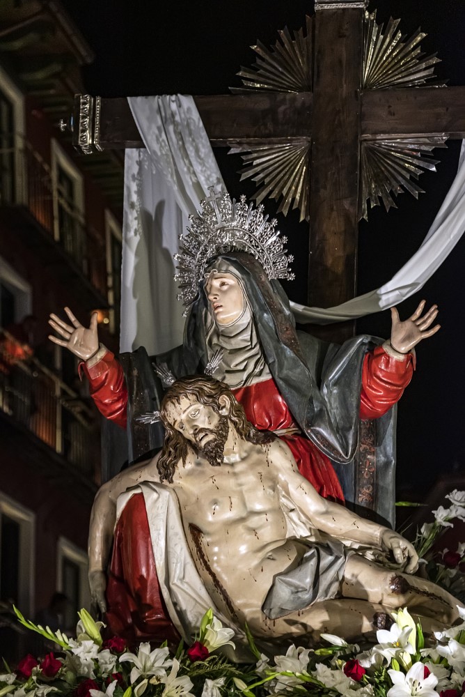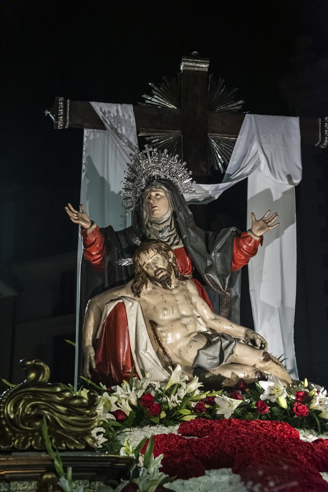 Procesión de la Piedad (Miércoles Santo, 24 horas). Procesión de Regla de la Cofradía, alumbrando su paso titular "La Quinta Angustia". El cortejo se inicia desde la Iglesia parroquial de San Martín en un multitudinario desfile acompañado por escuadrón a caballo, escuadra y alumnos de la Academia de Ávila del Cuerpo Nacional de Policía. En la Plaza del Salvador se produce un acto penitencial.