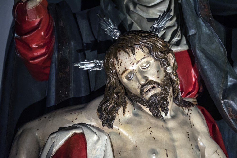 Cristo de la Cruz a María (Antonio de Ribera y Francisco Fermín, h. 1642; cuerpo de José de Arimatea, de José Antonio Saavedra, 1995). Fuera de Semana Santa, en el Museo Nacional de Escultura. Originalmente era el paso de El Entierro de Cristo con cinco figuras encargado por la cofradía a Gregorio Fernández en 1630, que se estrenó en 1642. En 1995 se recuperaron del Museo de Escultura el Cristo, Nicodemo y la cabeza de José de Arimatea, y Saavedra finalizó la reconstrucción de esta última figura, volviendo a desfilar ese año sobre una carroza nueva de madera de raulí, encargada al ebanista Fernández León.