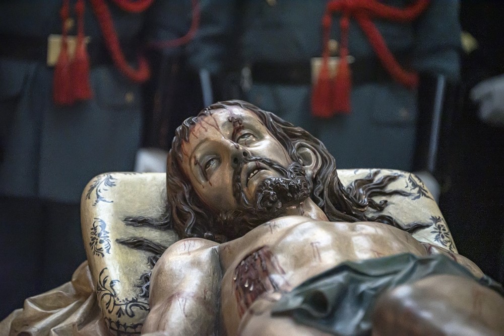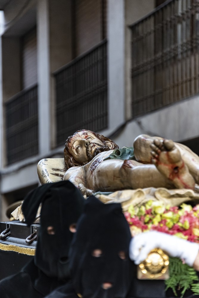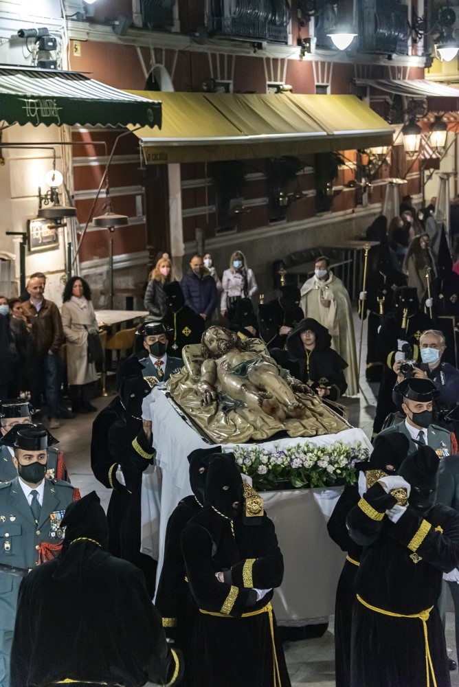 Procesión General de la Sagrada Pasión del Redentor (Viernes Santo, 19:30 horas). Es acompañado por el Piquete de Escolta de la Guardia Civil. Al regresar a su sede, lleva a cabo el acto del Epitaphion.