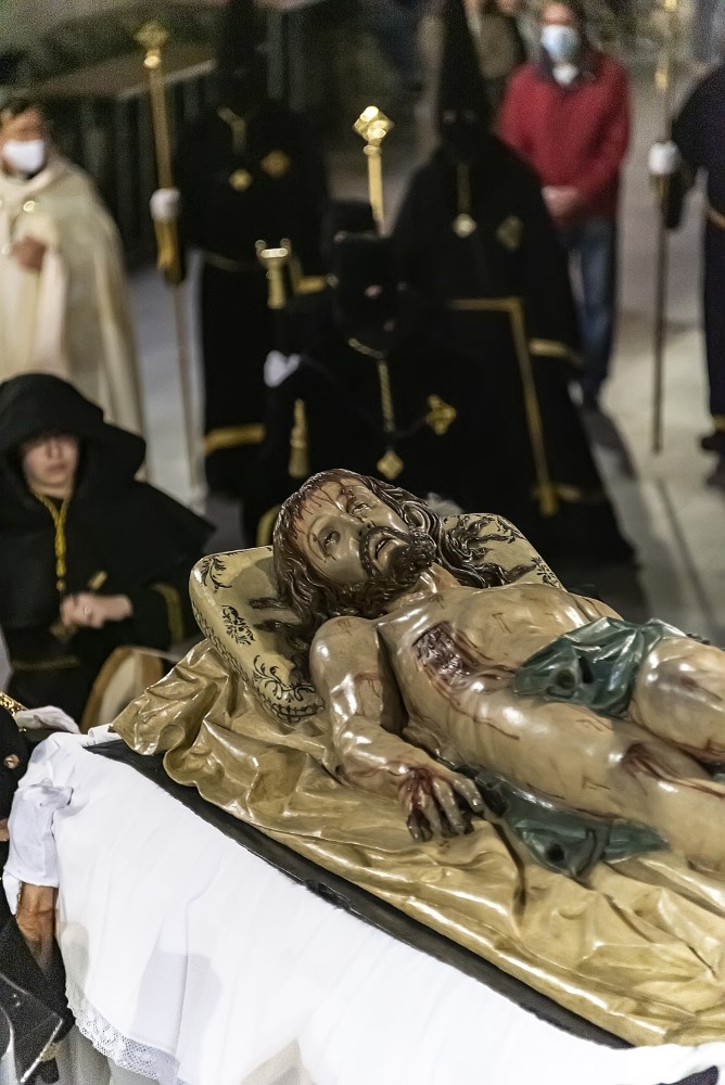 La imagen titular también es alumbrada en la Procesión General de la Sagrada Pasión del Redentor, que la Cofradía culmina en la plaza de Santa Ana con el Epitaphion.