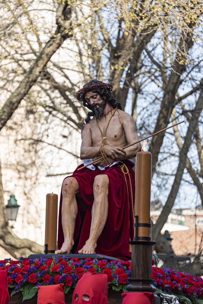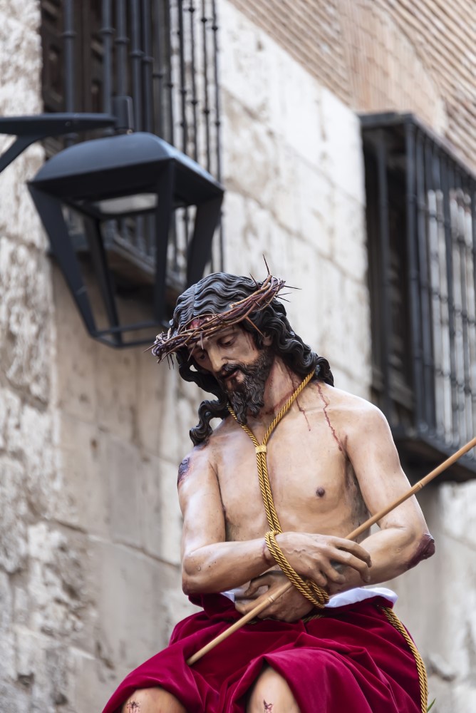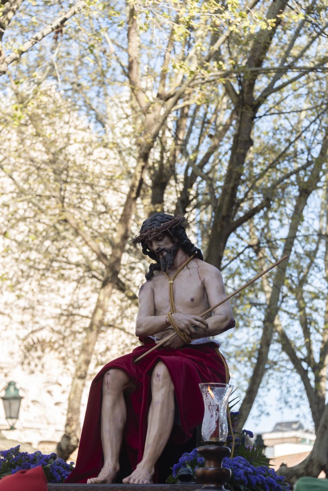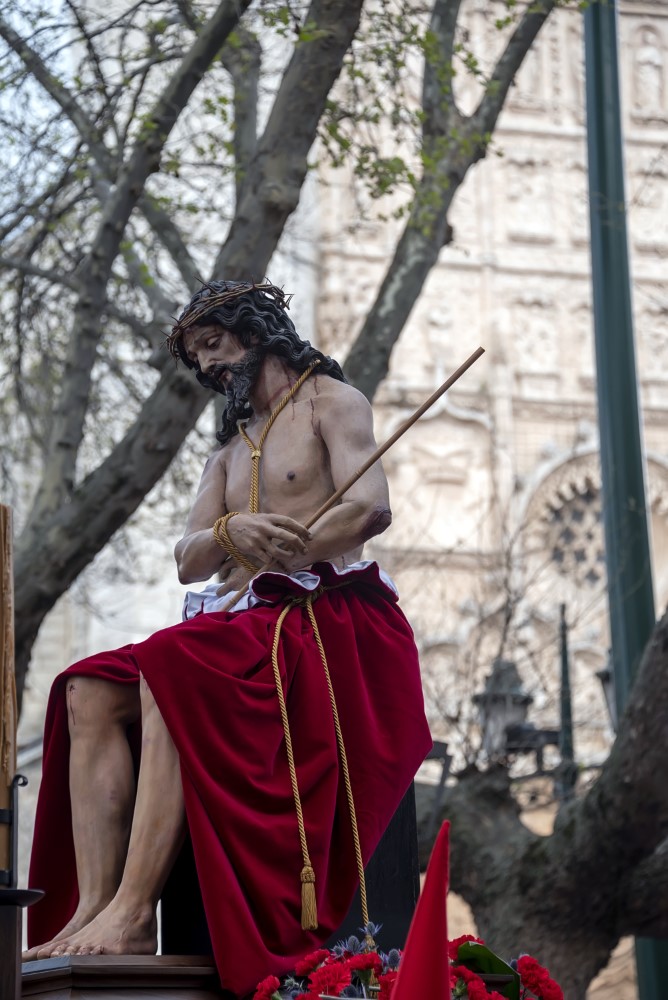La talla del Cristo de la Caña, realizada por Gregorio Fernández en 1622, representa a Jesús sentado, coronado de espinas naturales y vestido con una clámide púrpura. En su mano derecha sostiene una caña, símbolo de la burla que sufrió como Rey de los Judíos. Originalmente, el paso incluía cuatro figuras: el Cristo, un sayón arrodillado, y dos soldados con lanzas. Con el tiempo, los sayones originales desaparecieron, y los reemplazos fueron finalmente suprimidos del paso procesional.